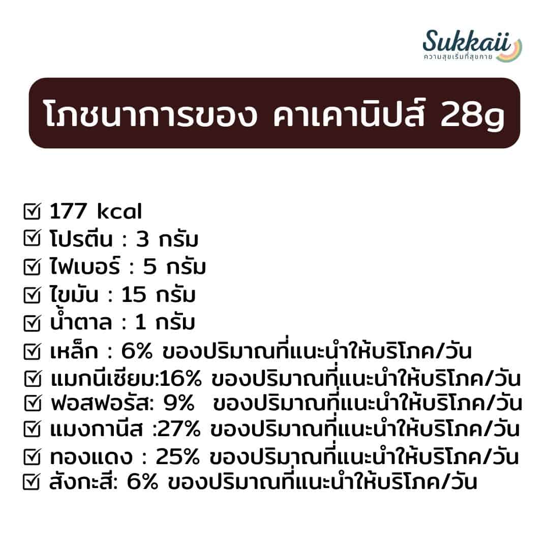 อย่างที่บอก คาเคานิบส์สามารถทานเปล่าๆได้เลย แต่จะมีรสชาติออกขมๆ ทั้งนี้ texture ของคาเคานิบส์จะมีความคล้ายคลึงกับถั่ว ดังนั้น ถ้าคุณเป็นคนที่ชินกับรสขมอยู่แล้วและเป็นสายรักสุขภาพ ก็สามารถทานคาเคานิบส์เปล่าๆเคี้ยวกรุบเพลินๆได้ไม่ยาก แถมได้ประโยชน์ไปเต็มๆ หรือจะนำไปประกอบในเครื่องดิื่มก็อร่อยเหมือนกัน